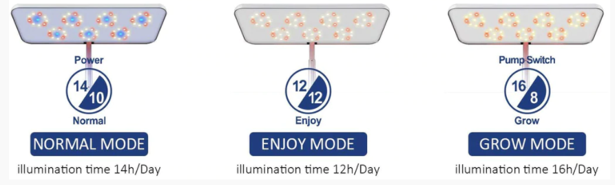 Enjoy Mode: it is to maintain your plants and display their beauty. the light intensity is reduced and will operate light on a 12-hours schedule.