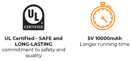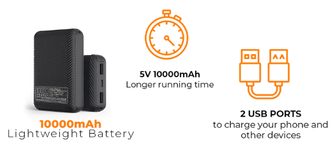 It uses UL/CE Certified Li-battery Portable 10000mAh 5V Power bank with 2 USB ports and 1 Type C, you will be able to charge your phone at the same time while warming your body.